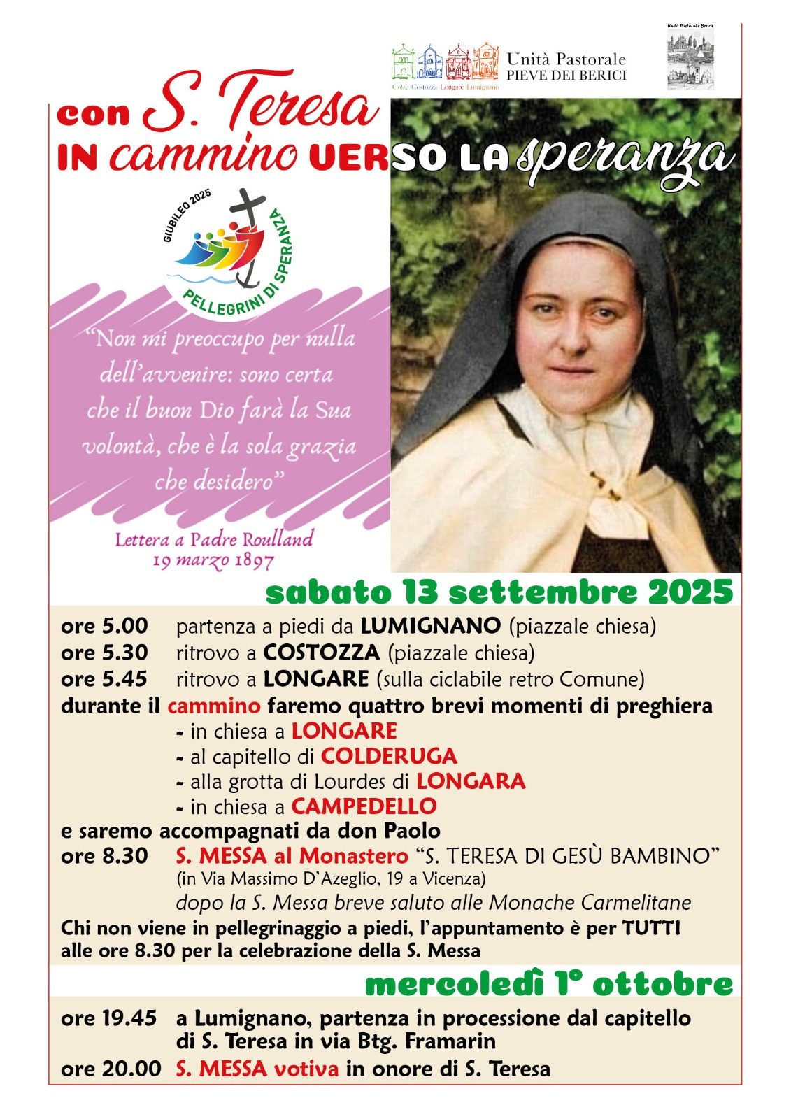 Le Unità Pastorali Berica e Pieve dei Berici organizzano per Sabato 13 Settembre un pellegrinaggio a piedi con partenza alle ore 05:00 dal piazzale della Chiesa di Lumignano (e successivi ritrovi a Costozza e Longare), momenti di preghiera e arrivo alle ore 08:30 per la S. Messa al Monastero “S. Teresa di Gesù Bambino” (via Massimo D’Azeglio 19 a Vicenza).